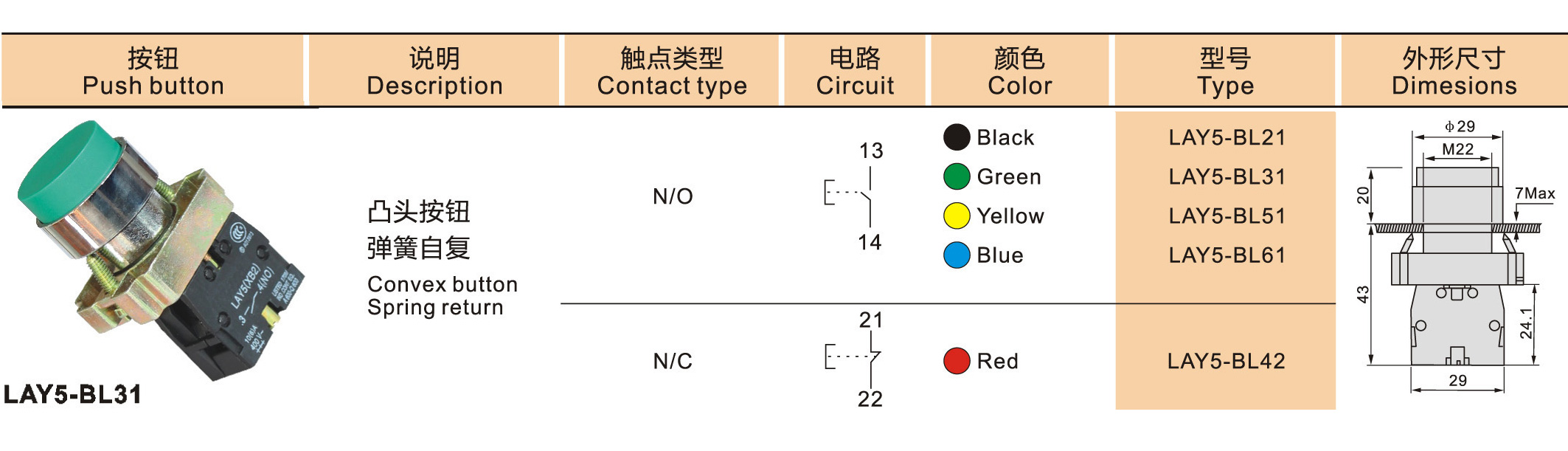 The push button series are used in controlling circuit of AC voltage up to 660V/AC 50Hz, and DC voltage below 400V.It is used for controlling signal and interlocking purposes. The main body of the push buttons adopts zinc alloy and high-grade anti-flam plastic.The contact adopts special silver alloy in order to enjoy the benefit of high anti-electrical erosion. The signal lamp series are suitable for electrical appliances circuit of Ac voltage up to 380V/50Hz, and DC voltage below 380v,It is ideal for using as indicating signals,warning signals, emergency signals, etc. Our products comply with GB/T14048 1 and lEC60947-5-1, all products are CE,ISO9001,ROHS and UL certified.